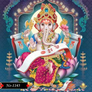 This vibrant artwork depicts Lord Ganesha seated on a pink lotus, radiating knowledge and divinity. He holds a lotus flower, a pen, and a scroll, symbolizing wisdom, intellect, and new beginnings. The glowing lamps and rich ornamentation add to the spiritual and festive atmosphere.