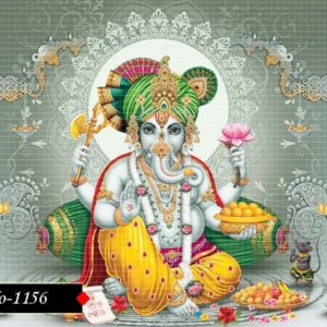 Ganesha is adorned in a vibrant green and pink turban and a yellow patterned dhoti, seated on a patterned cushion. His expression is serene as he holds a lotus and a bowl of sweets, rendered in a decorative and slightly stylized manner. The background is a muted grey with ornate silver and gold architectural and floral designs, flanked by traditional lamps and offerings.