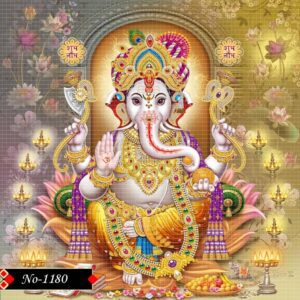 Ganesha, with a golden crown and jewelry, is seated on a pink lotus in a cross-legged posture. He wears a yellow and gold dhoti with purple accents. The overall tone is devotional and ornate, set against a floral patterned background in soft earthy tones with glowing lamps. The environment depicted suggests a sacred and auspicious setting.
