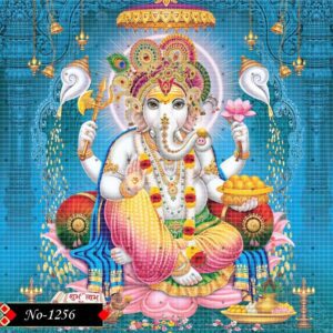 This vibrant digital artwork portrays Lord Ganesha seated in a divine and regal posture, exuding blessings. Holding a lotus, an axe, a modak plate. Ganesha symbolizes purity, strength, prosperity, and protection.