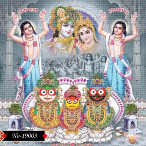 This spiritual image showcases Gour and Nitai in an ecstatic dance, dressed in vibrant Vaishnav robes that echo the joy of devotion. Behind them stand the divine forms of Radha-Krishna and Jagannath, Balram, and Subhadra, adorned in resplendent garments and shining ornaments. The entire composition radiates purity and grace. Each deity glows with sacred energy, evoking deep reverence. This artwork captures the living spirit of Sanatan Dharma and the path of bhakti.