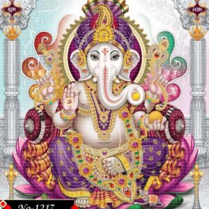 A digital painting of Ganesha, serene expression, His four arms hold a lotus flower, a sprig of leaves, and display the abhaya mudra. Traditional Indian lamps are subtly incorporated into the surrounding foliage. The overall style should be ornate and spiritual, with a soft, glowing ambiance.