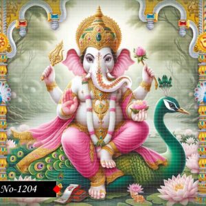 This image depicts Ganesha, the Hindu god of beginnings and remover of obstacles. He is seated regally on a peacock, his vahana (vehicle), amidst lotus flowers and leaves in a serene aquatic environment. Ganesha has a light complexion and is adorned with a golden crown and intricate gold jewelry. He wears a vibrant pink dhoti and a flowing pink shawl.