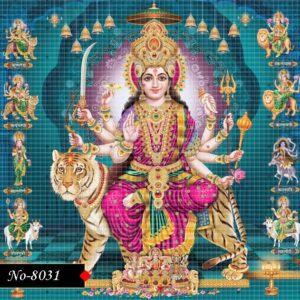 In this divine representation, Goddess Ambaji sits powerfully atop her tiger, radiating cosmic energy. Her multiple arms are adorned with sacred weapons and graceful blessings. She is the center of the Navadurga circle, surrounded by her many divine forms. Her crown sparkles with heavenly jewels, and her aura glows with divine warmth.