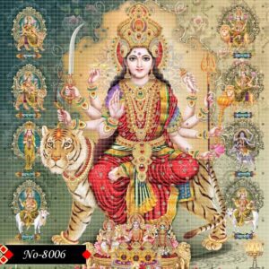 Goddess Ambaji sits regally on a fierce tiger, radiating strength and divinity. She is adorned in a bright red saree with golden ornaments that gleam with celestial brilliance. Each of her ten hands holds a divine weapon or sacred symbol, signifying her power to protect and destroy evil. Her calm face exudes grace, even as she carries the sword, trident, conch, and lotus. The vibrant aura behind her glows with divine energy. Around her are depictions of the nine forms of Durga, representing Navadurga. The intricately designed background features a balance of floral and cosmic patterns. This image evokes devotion, reverence, and the triumph of good over evil.
