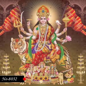 Goddess Ambaji sits regally on a fierce tiger, radiating strength and divinity. She is adorned in a bright red saree with golden ornaments that gleam with celestial brilliance. Each of her eight hands holds a divine weapon or sacred symbol, signifying her power to protect and destroy evil. Her calm face exudes grace, even as she carries the sword, trident, conch, and lotus. The vibrant aura behind her glows with divine energy.