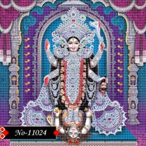 Her attire is intricately detailed, featuring a long garland of human heads and a skirt fashioned from severed arms, all rendered with elaborate designs. The overall color scheme is dominated by shades of purple, blue, and white, giving the image a mystical and serene quality, contrasting with the typical red and black associations of Kali. The goddess is framed by an ornate archway and two decorative pillars, reminiscent of temple architecture, enhancing the sacredness of the scene. The backdrop is rich with intricate patterns, adding depth and texture to the composition.