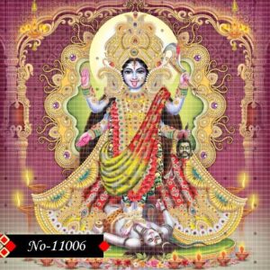 This artwork captures Goddess Kali in a vividly detailed form, glowing with divine fire and celestial ornaments. She stands with one foot on the supine Lord Shiva, signifying humility and cosmic balance. Her garland of skulls and black backdrop mark her as the vanquisher of ego and illusion.