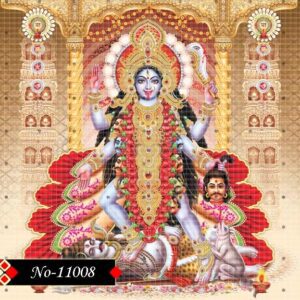 This divine image of Goddess Kali presents her in her iconic pose, adorned with celestial jewelry, radiating strength and grace. She stands over Lord Shiva with majestic poise, embodying the feminine power that drives the cosmos. Her red tongue, skull garland, and weaponry assert her as the destroyer of demonic forces.