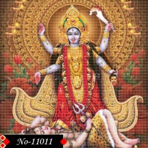 Goddess Kali is seen here in divine regalia, wearing a golden robe that flows majestically behind her. Her trident and sword radiate divine energy, reflecting her mission to annihilate evil. The serene expression on her face contrasts beautifully with her fearsome garland of skulls. The fiery glow in the background reinforces her dynamic and transformative nature.
