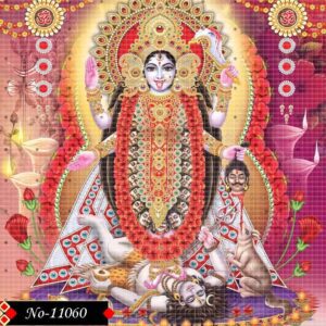 Goddess Kali stands majestically, her four arms radiating divine power and command. Clad in a resplendent golden attire and an ornate crown, she exudes both beauty and dread. Her fierce gaze pierces through illusion, symbolizing the destruction of ignorance. The garland of red hibiscus flowers and severed heads reflects her role as the vanquisher of evil. She stands atop Lord Shiva, emphasizing the moment of divine realization and cosmic balance. Her long black hair flows wildly, showcasing the untamed aspect of Shakti. The intricate temple arches and floral garlands behind her add a sanctified aura. This image captures Kali in her awe-inspiring form—destructive, compassionate, and supreme.