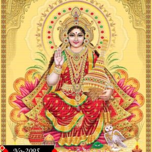 The artwork vibrantly portrays Goddess Lakshmi, a central figure in Hindu mythology, embodying wealth and prosperity. Her traditional red sari with golden embellishments signifies auspiciousness and richness.