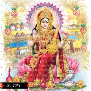 Goddess Lakshmi shines brightly. She wears a glowing red saree with elegant gold work.
