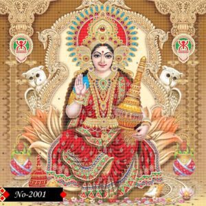 Goddess Lakshmi sits adorned in vibrant red attire, radiating divine elegance.