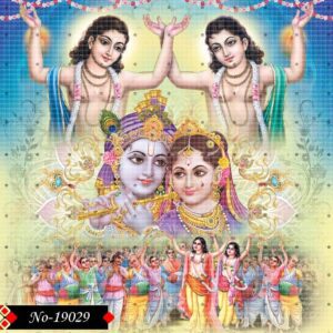 Here, the spiritual joy of Gour and Nitai’s dance is immortalized, their forms adorned in holy robes. Behind them, the serene figures of Radha-Krishna glimmer with divine light, representing the timeless beauty of Sanatan Dharma’s devotion.