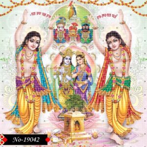 The image exudes devotion as Chaitanya and Nityananda dance in harmony. Dressed in traditional Vaishnav robes, they are accompanied by the glowing presences of Radha-Krishna and the majestic forms of Jagannath, Balram, and Subhadra, forming a tapestry of divine unity.