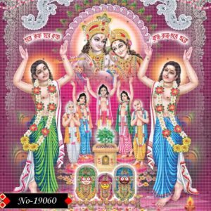 Chaitanya and Nityananda, drenched in spiritual joy, are shown dancing in grace and devotion. Behind them, the serene forms of Radha-Krishna and the deities of Jagannath, Balram, and Subhadra radiate divine brilliance—together manifesting the soul of Sanatan Dharma.