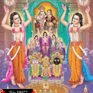 This image gracefully presents Chaitanya Mahaprabhu and Nityananda Prabhu dancing in divine ecstasy. Adorned in sacred attire, they are surrounded by the glowing presence of Radha-Krishna and the deities of Jagannath, Balram, and Subhadra, making this a radiant portrayal of devotion and divine unity.