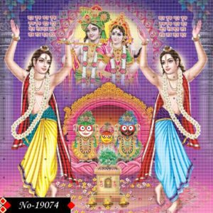 A heavenly celebration of devotion unfolds as Gour and Nitai dance in joy, dressed in Vaishnav finery. The background glows with Radha-Krishna and the vibrant forms of Jagannath, Balram, and Subhadra. Together, they create a luminous atmosphere filled with the essence of Sanatan Dharma.