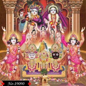 Chaitanya Mahaprabhu and Nityananda Prabhu dance in divine ecstasy in this soulful composition. Behind them, the deities Radha-Krishna and Jagannath, Balram, and Subhadra radiate divine brilliance, bringing together the energies of love, devotion, and cosmic harmony.