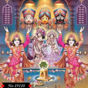 Chaitanya and Nityananda, drenched in spiritual joy, are shown dancing in grace and devotion. Behind them, the serene forms of Radha-Krishna and the deities of Jagannath, Balram, and Subhadra radiate divine brilliance—together manifesting the soul of Sanatan Dharma.