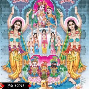Radiating spiritual charm, this image captures Gour and Nitai dancing in harmony, clothed in traditional Vaishnav robes. The background reveals Radha-Krishna and the holy siblings—Jagannath, Balram, and Subhadra—illuminated by divine light. A powerful symbol of bhakti, this composition speaks to the heart of Sanatan Dharma.