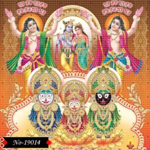Radiating spiritual charm, this image captures Gour and Nitai dancing in harmony, clothed in traditional Vaishnav robes. The background reveals Radha-Krishna and the holy siblings—Jagannath, Balram, and Subhadra—illuminated by divine light. A powerful symbol of bhakti, this composition speaks to the heart of Sanatan Dharma.