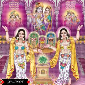 The image exudes devotion as Chaitanya and Nityananda dance in harmony. Dressed in traditional Vaishnav robes, they are accompanied by the glowing presences of Radha-Krishna and the majestic forms of Jagannath, Balram, and Subhadra, forming a tapestry of divine unity.