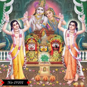 Gour and Nitai’s divine dance is the centerpiece of this radiant image, symbolizing the joy of surrender. Radha-Krishna and Jagannath, Balram, and Subhadra grace the background, wrapped in the glow of devotion and spiritual bliss.