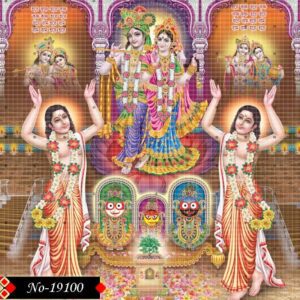 Gour and Nitai’s divine dance is the centerpiece of this radiant image, symbolizing the joy of surrender. Radha-Krishna and Jagannath, Balram, and Subhadra grace the background, wrapped in the glow of devotion and spiritual bliss.