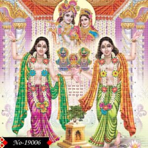 This sacred artwork depicts Gour (Chaitanya Mahaprabhu) and Nitai (Nityananda Prabhu) joyfully dancing in traditional Vaishnav attire. Behind them, the divine forms of Radha-Krishna shine in resplendent clothing and jewelry, radiating pure spiritual energy. The entire scene is a vivid portrayal of bhakti, peace, and the divine essence of Sanatan Dharma.