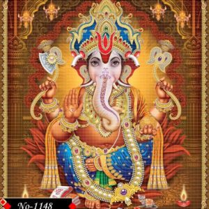 Lord Ganesha is depicted sitting on a stylized lotus flower, radiating a divine aura. He wears an elaborate golden crown with blue accents and is adorned with numerous gold ornaments. In his four hands, he holds a battle-axe, a goad, a sweet treat (possibly a laddu), and his lower right hand is raised in the abhaya mudra, offering protection. A small mouse, his vahana, is near his feet amidst offerings of flowers and what appears to be a holy book, all set against a richly decorated, temple-like background with glowing lamps.