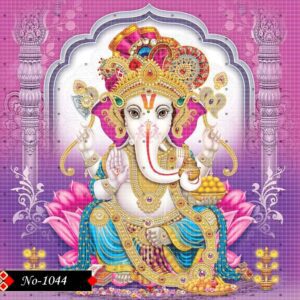 This stunning illustration portrays Lord Ganesha in a majestic and serene form, seated on a blooming lotus. Dressed in vibrant blue and gold attire with intricate jewelry, the deity exudes divine elegance. The background features a temple-like arch and radiant pink hues, enhancing the sacred aura. With symbolic items like the modak, lotus, and a blessing hand, this artwork beautifully captures the essence of wisdom, prosperity, and spiritual harmony.
