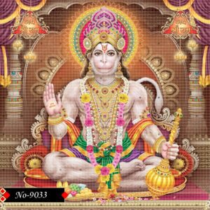 Hanumanji is depicted as a divine guardian, seated on a majestic throne adorned with floral and golden motifs. His entire body is covered in jewels and traditional ornaments. A soft yet fierce glow surrounds him, showcasing his spiritual power. His right hand is raised in Abhaya Mudra, offering protection. The left hand grasps his gada, reflecting readiness for righteous action.
