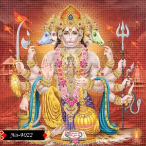 Panchmukhi Hanuman is depicted in all his majestic glory, seated gracefully with ten arms and five divine faces. His central face glows with devotion, while the others—each unique—emit divine energy. Hanuman appears as both protector and nurturer, full of strength and blessings.