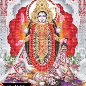 In this radiant depiction, Kali is the ultimate judge of karma. Her stance is firm, unmoved, and all-powerful. Her weapons flash with divine energy, while her blessing hands offer release. The severed head and garland of skulls narrate the destruction of ego. Shiva’s calm posture beneath her reminds us of inner balance. The ornamental backdrop adds a ceremonial grandeur. Her golden attire is not just decoration—it’s a sign of divine justice. This image teaches that truth, though fierce, is liberating.