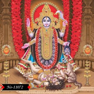 This image of Kali Ma burns with the fire of spiritual liberation. Her radiant crown and golden chest plate mark her as the ultimate Devi. The garland of skulls and extended tongue depict her fearsome nature. Yet her expression holds divine serenity, balancing destruction with grace. Lord Shiva at her feet offers the perfect counterbalance. The floral arch behind her mirrors the blossoming of truth from chaos. She stands in eternal dance, defeating ignorance with every step. A beacon of the unstoppable feminine force, she reigns supreme.