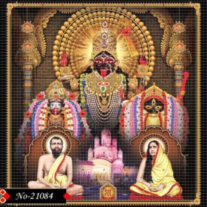 This holy depiction shows Ramakrishna Paramahamsa and Sarada Devi in peaceful unity, enveloped in golden light. The towering presence of Goddess Kali in the background completes the image of divine harmony.