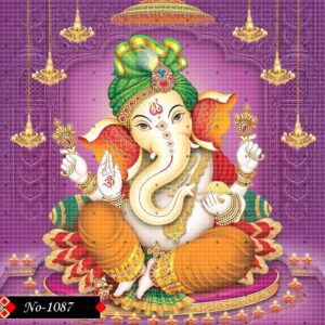 This fifth image of Lord Ganesha is striking with its traditional and festive palette — rich purples, greens, and golds. The background is adorned with glowing oil lamps, enhancing the divine and celebratory atmosphere. Lord Ganesha’s calm expression and symbolic hand gestures (mudras) exude protection and blessings.