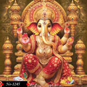 Divine illustration of Lord Ganesha adorned with luxurious golden and purple jewelry, multiple pearl garlands, and a grand golden crown decorated with red and green gemstones. He has four arms holding a lotus, a modak (sweet), an axe, and one hand in Abhaya Mudra .