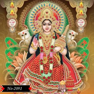 This vivid image features Goddess Lakshmi, adorned in a rich red and gold sari, seated upon a large lotus blossom at its center. She is elaborately decorated with ornate gold jewelry, including a grand crown and multiple necklaces, exuding an aura of divine splendor.