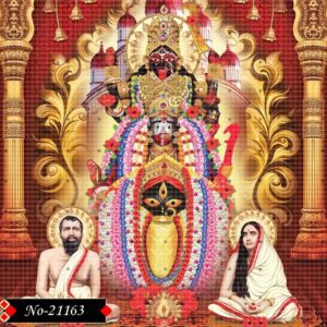 A spiritually rich image featuring Sri Ramakrishna and Holy Mother Sarada Devi, with the divine form of Goddess Kali standing behind. The glowing background reflects enlightenment, purity, and heavenly peace.