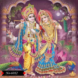 This image reflects the divine love of Radha and Krishna in spiritual harmony. Golden jewelry sparkles against their divine faces, rich with serenity.