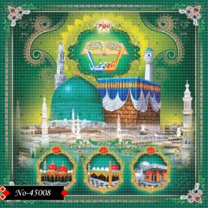 Evoking the divine power of “Bismillah” through the number 786, this artwork gracefully presents the tranquil beauty of Makkah and Madinah. The use of golden highlights and soothing colors brings out a sense of calm and reverence. Each element invites the viewer to connect with the spiritual soul of Islam and appreciate its sacred legacy.
