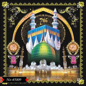 Evoking the divine power of “Bismillah” through the number 786, this artwork gracefully presents the tranquil beauty of Makkah and Madinah. The use of golden highlights and soothing colors brings out a sense of calm and reverence. Each element invites the viewer to connect with the spiritual soul of Islam and appreciate its sacred legacy.