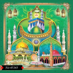 This artwork is a visual embodiment of Islamic faith, radiating peace and devotion through sacred symbols and serene design. The calm color palette and intricate details invite the viewer into a moment of spiritual reflection.