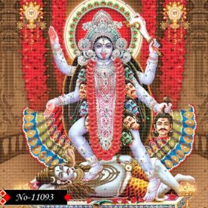 Kali Ma, in this divine portrayal, stands not just as a goddess but as the cosmic force of life and death. Her raised arms, bloodied weapon, and fearsome tongue signify the ferocity of divine justice. Yet, there is calm in her chaos — seen in the serene face of Lord Shiva beneath her feet. The garland of human heads around her neck isn’t grotesque; it is a statement of victory over the vices of the world. Her elaborate crown and ornaments suggest the richness of divine power, while her posture reflects the ultimate surrender and divine realization. Each symbol — from the trident to the lotus base — ties the spiritual and material worlds together. This image isn’t just art; it’s a meditation on destruction as a path to renewal. Kali here becomes the mother of cosmic transformation.