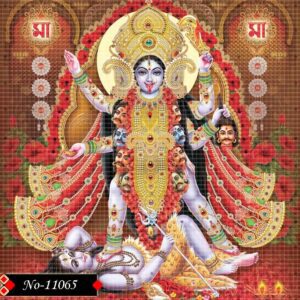 Kali Ma is depicted in this artwork as the embodiment of the universe’s raw power. Her tongue extended in a dramatic expression reminds viewers of her uncontrolled wrath and awakening. Surrounded by garlands and weapons, she dominates the scene with spiritual might. Lord Shiva beneath her calms the chaos, reflecting harmony in destruction. The fine detailing in the architecture around her adds to the sanctity. This image resonates with Kali’s role as both destroyer and redeemer.