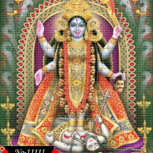 Ma Kali stands tall as the eternal guardian of truth and righteousness. Her expression, intense and all-seeing, reveals her role as judge and protector. Her feet rest on Lord Shiva, showcasing the moment she is reminded of her divine nature. Each hand bears a powerful symbol—cutting illusions, offering blessings, and holding victory over death. The floral patterns and vibrant hues evoke a sense of sacredness. Her skull garland is a testament to ego annihilation. With an aura of crimson and gold, she demands both reverence and surrender. This powerful vision instills devotion and awe.