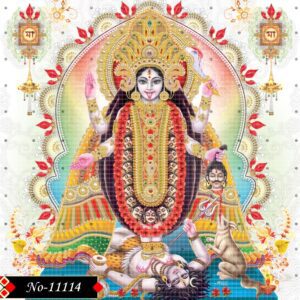 Kali’s stance here is one of defiance against illusion and maya. Her intense gaze breaks through worldly attachments and ego. The severed head in her hand is not terror, but truth unmasked. Standing over Shiva, she embodies the moment of cosmic awareness. Her rich attire of gold and red celebrates divine femininity. Every part of the image, from her tongue to the blood-stained sword, screams transformation. The mandala-like background enhances the sacred geometry of her form. Kali here is not just a goddess—she is the awakening.